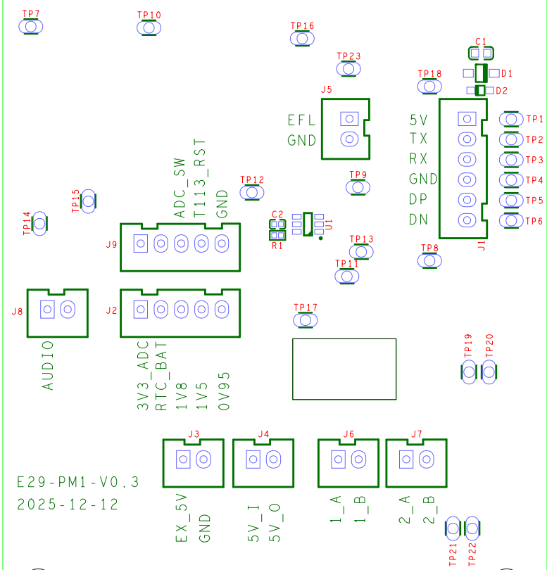 # 1. 上位机与测试机交互说明 * 波特率:38400 * 通讯方式:USART * 下位机按钮提示指令:TEST:Start:End * 上位机测试指令:TEST:E29:End * 上位机功耗测试完毕返回指令:TEST:ON:End # 2. 串口测试步骤(非APP测试) 串口测试得前提是已经烧入了三元组、MAC地址 1. 发送:"TEST:Start:End"(控制器4会亮屏) 2. 发送:"TEST:ON:End"(没有现象) 3. 等待控制器4H得屏幕显示日期以后,发送:"factory\r\n"(屏幕会显示进入工厂测试模式得界面) 4. 发送:"start\r\n"(开始测试功能项) # 3. 测试机返回测试结果 "TEST:E29;Volt_3.3V:3325;Volt_Bas:3327;Volt_1.5V:1537;Volt_0.95V:0974;CAP:1490;Ver:1.0.27;BLE_Mac:541122334401;BLE_Rssi:-015;Wifi_Mac:0ccdb40b6f2d;Wifi_Rssi:-065;Cur:151885mA;Error:000;End" | 帧格式 | 帧说明 | 数据长度 | | --- | --- | --- | | Volt_3.3V | 芯片3.3V电压 | 4 | | Volt_Bas | 底板3.3V电压 | 4 | | Volt_1.5V | 1.5V电压 | 4 | | Volt_0.95V | 0.95V电压 | 4 | | CAP | RTC电容电压值 | 4 | | Ver | 软件版本 | 6 | | Bt_Mac | 蓝牙MAC地址 | 12 | | Bt_Rssi | 蓝牙信号强度 | 4 | | Wifi_Mac | Wifi MAC地址 | 12 | | Wifi_Rssi | Wifi信号强度 | 4 | | Cur | 产品待机电流值 | 8 | | Error | 错误代码 | 3 | ## 4. 错误代码说明 | 错误代码 | 说明 | 建议排查方向 | | --- | --- | --- | | 000 | 测试通过 | 无 | | 001 | 3.3V电压异常 | 3.3V供电异常,请检测电源芯片(TP9) | | 002 | 底板3.3V电压异常 | 3.3V供电异常,请检测电源芯片(TP8) | | 003 | 1.8V电压异常 | 1.8V供电异常,请检测电源芯片(TP10) | | 004 | 1.5V电压异常 | 1.5V供电异常,请检测电源芯片(TP11) | | 005 | 0.95V电压异常 | 0.95V供电异常,请检测电源芯片(TP12) | | 006 | RS485_1异常 | RS485_1通讯异常,请检测RS485_1芯片(TP19、TP20) | | 007 | RS485_2异常 | RS485_2通讯异常,请检测RS485_2芯片(TP21、TP22) | | 008 | 按键检测异常 | 请检测是否按键按下,如果确认按下按键,那么产品问题 | | 009 | 屏幕检测错误 | 产品问题 | | 010 | RTC通信异常 | 产品问题 | | 011 | BLE信号异常 | 用手机检测测试机周边是否存在MAC地址为:94:3C:C6:83:70:B6蓝牙广播 | | 012 | Wifi信号异常 | 确认手机热点已打开(WIFI名:test@version,WIFI密码:1234567!) | | 013 | RTC CAP电容电压值 | 产品问题 | | 100 | 电流值检测异常 | 检查测试机是否是24V供电 | ## 5. 顶针板位号图