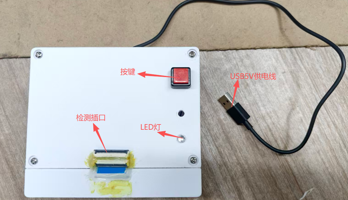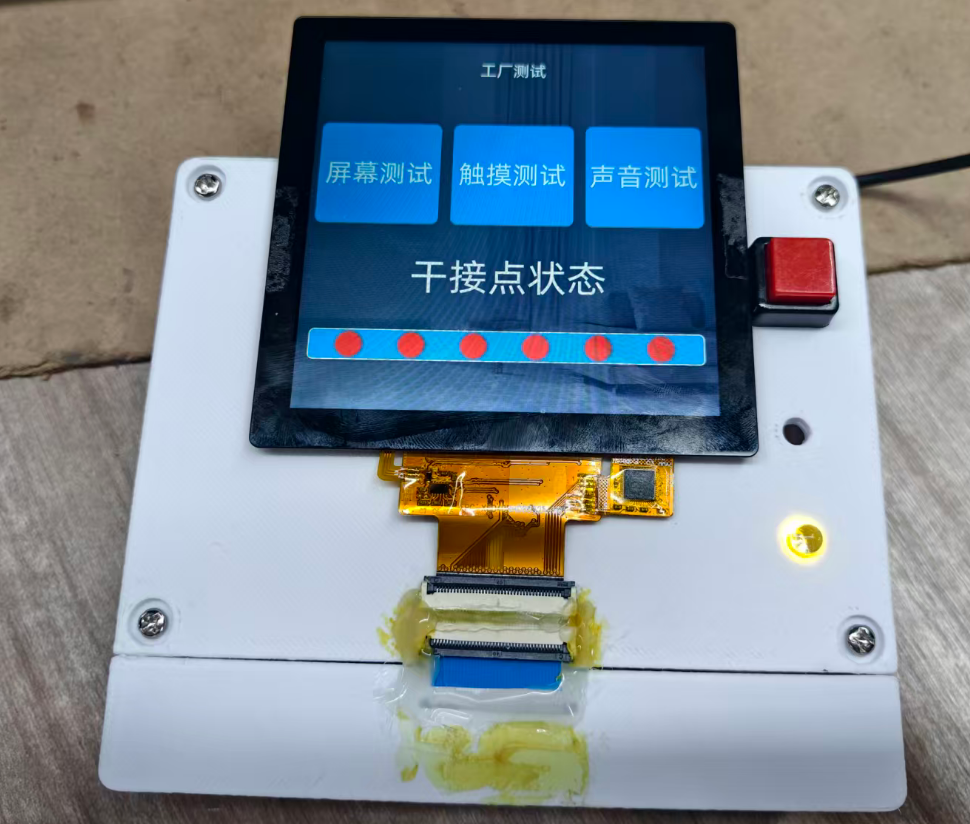 [【附件】屏幕检测.mp4](/media/attachment/2026/01/%E5%B1%8F%E5%B9%95%E6%A3%80%E6%B5%8B.mp4) # 注意:屏幕线插入检测口的时候,LED灯一定要是熄灭状态(不能让屏幕带电进行热插拔,会导致屏幕损害)!!! # 一、使用步骤   1、把USB供电线插入电脑USB口供电,或者使用手机充电器也可以供电,供电电压为5V。 2、然后把待检测的屏幕插入检测口插座上,注意金手指朝下,如下图。  3、按下红色按钮,此时会听到蜂鸣器响一声(提示成功按下按键),并且LED灯会亮,代表屏幕通电成功。如果LED灯亮了,但是屏幕没有显示画面,代表屏幕显示测试异常。正常情况如下图。  4、等待屏幕画面如下图所示,大概20s左右。  5、点击中间`触摸测试`。开始测试屏幕触摸。触摸测试就是去触摸每个小方块,当全部小方块都触摸完成以后,就代表触摸测试完成。具体测试流程可以查看附件中的屏幕检测视频。 6、检测完成后,再次按下红色按钮进行屏幕断电。然后更换下一个屏幕进行测试即可 # 注意:屏幕线插入检测口的时候,LED灯一定要是熄灭状态(不能让屏幕带电进行热插拔,会导致屏幕损害)!!!