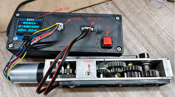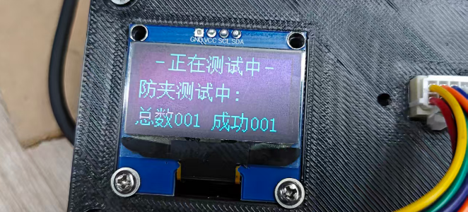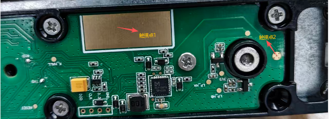 [【附件】霍尔板测试过程.mp4](/media/attachment/2026/02/%E9%9C%8D%E5%B0%94%E6%9D%BF%E6%B5%8B%E8%AF%95%E8%BF%87%E7%A8%8B.mp4) # 注意:测试内开4霍尔板之前,一定要带静电环,穿静电服,避免损坏霍尔板!!! # 一、使用步骤  1.先给工装供12V电源(电源适配器已配好,直接插上即可)。 2.插上电机线、霍尔串口线。 3.按下红色的按钮开始测试(此时屏幕上也会提示:按下按键开始测试)。 4.按下按键后,来回拧动手动开关(此时屏幕上也会提示:请拧动手动开关)。  5.此时等待屏幕上提示:防夹测试中。  6.请在提示的10s内,用同一只手同时触摸两个点,请看下图:  7.防夹测试成功,屏幕会显示:"防夹测试中:通过" 8.最后等待屏幕反馈测试结果即可。 # 注意:测试内开4霍尔板之前,一定要带静电环,穿静电服,避免损坏霍尔板!!!