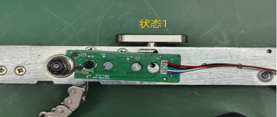 # 一、使用步骤  1.检测霍尔前,先按照如上图所示接好线。电源供电口接8V直流电源。 2.接好线并且上电后,拨动手动开关,如下图所示,从状态1到状态2,再到状态1。   3.第一次按下按键,此时电机会正转。第二次按下按键,此时电机会反转。第三次按下按键,此时电机会停止转动,并且通过LED灯以及蜂鸣器返回测试结果。==注意:电机正转、反转最小转动时间为5s,没有转够5s,按下按键,按键是不生效的==。 * 如果霍尔检测成功,电机运行时,正、反转电流正常,led灯为绿色,蜂鸣器不会响。 * 如果霍尔检测成功,电机运行时,正转电流异常,反转电流正常,led灯为红色,蜂鸣器响一声。 * 如果霍尔检测成功,电机运行时,正转电流正常,反转电流异常,led灯为红色,蜂鸣器响两声。 * 如果霍尔检测成功,电机运行时,正转电流异常,反转电流异常,led灯为红色,蜂鸣器响三声。 * 如果霍尔检测失败,电机运行时,正、反转电流正常,led灯为红色,且灯会闪烁一次(灭->亮->灭->亮),蜂鸣器不会响。 * 如果霍尔检测失败,电机运行时,正转电流异常,反转电流正常,led灯为红色,且灯会闪烁一次(灭->亮->灭->亮),蜂鸣器响一声。 * 如果霍尔检测失败,电机运行时,正转电流正常,反转电流异常,led灯为红色,且灯会闪烁一次(灭->亮->灭->亮),蜂鸣器响两声。 * 如果霍尔检测失败,电机运行时,正转电流异常,反转电流异常,led灯为红色,且灯会闪烁一次(灭->亮->灭->亮),蜂鸣器响三声 4.检测下一个霍尔板只需更换电机线和霍尔线,然后重复2到3步骤即可。